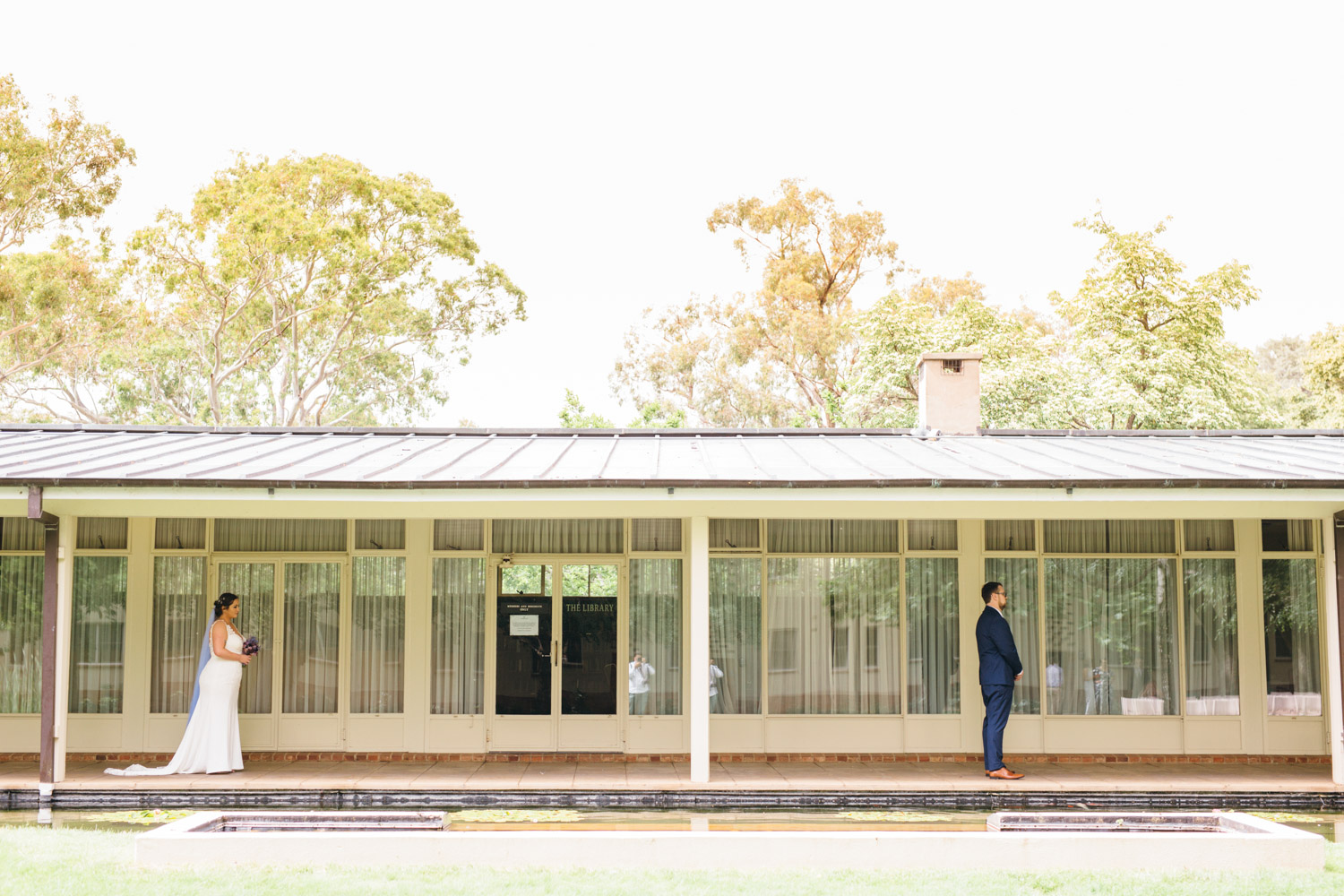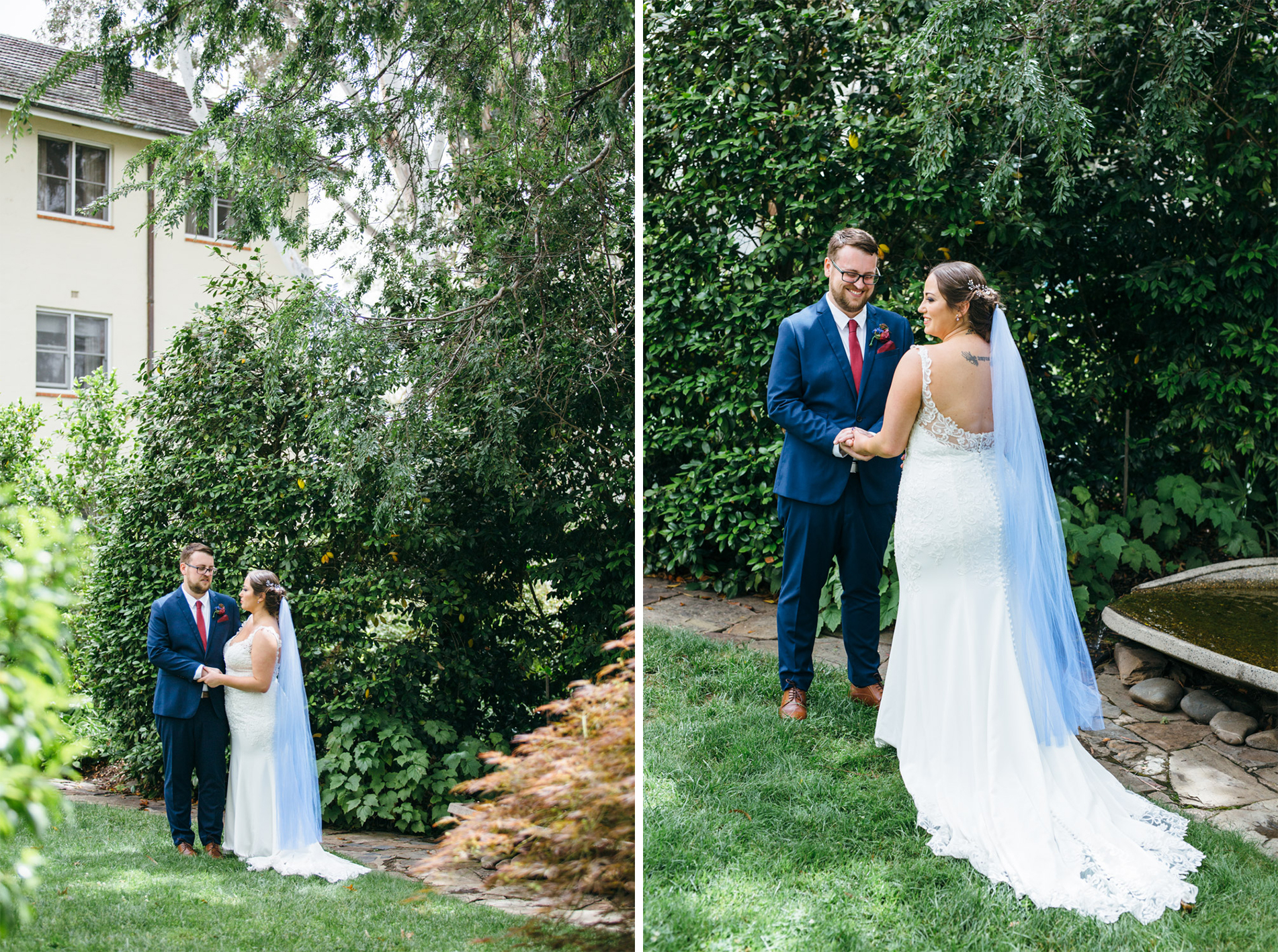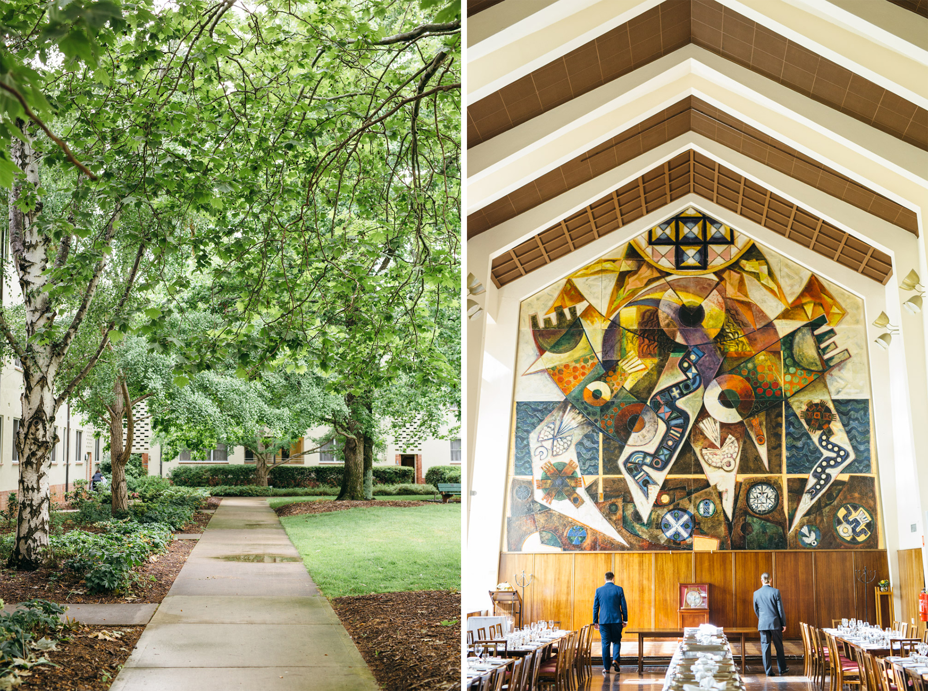 I was in the town of Lithgow to the west of the Blue Mountains, when Skye gave me a call. Skye and Matt had planned their wedding in Canberra at the Australian National University. University House, ANU, is significant to Skye because her parents had a long history with academia, and ANU was a large part of their lives for several years. Skye and Matt’s wedding would be held in buildings with prominent architectural brilliance, and so challenged me to include the architecture of the buildings in their wedding photos.