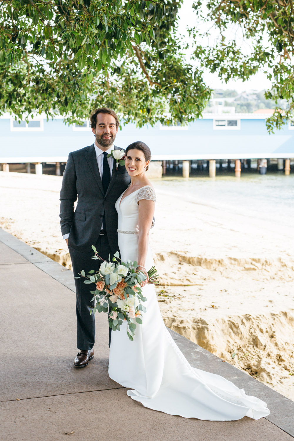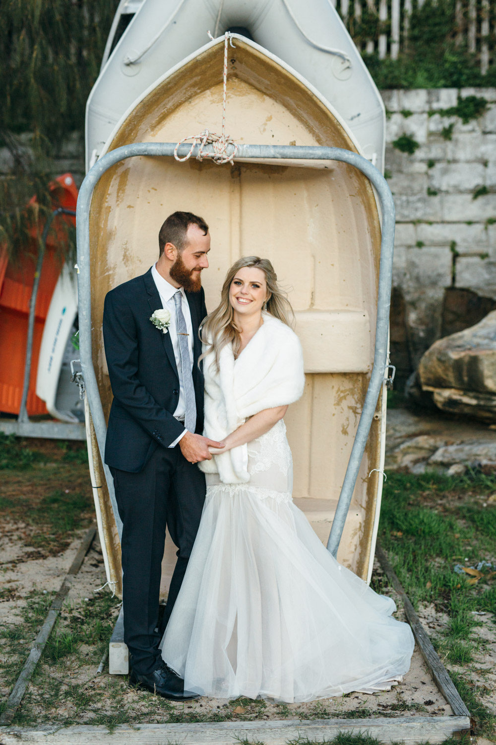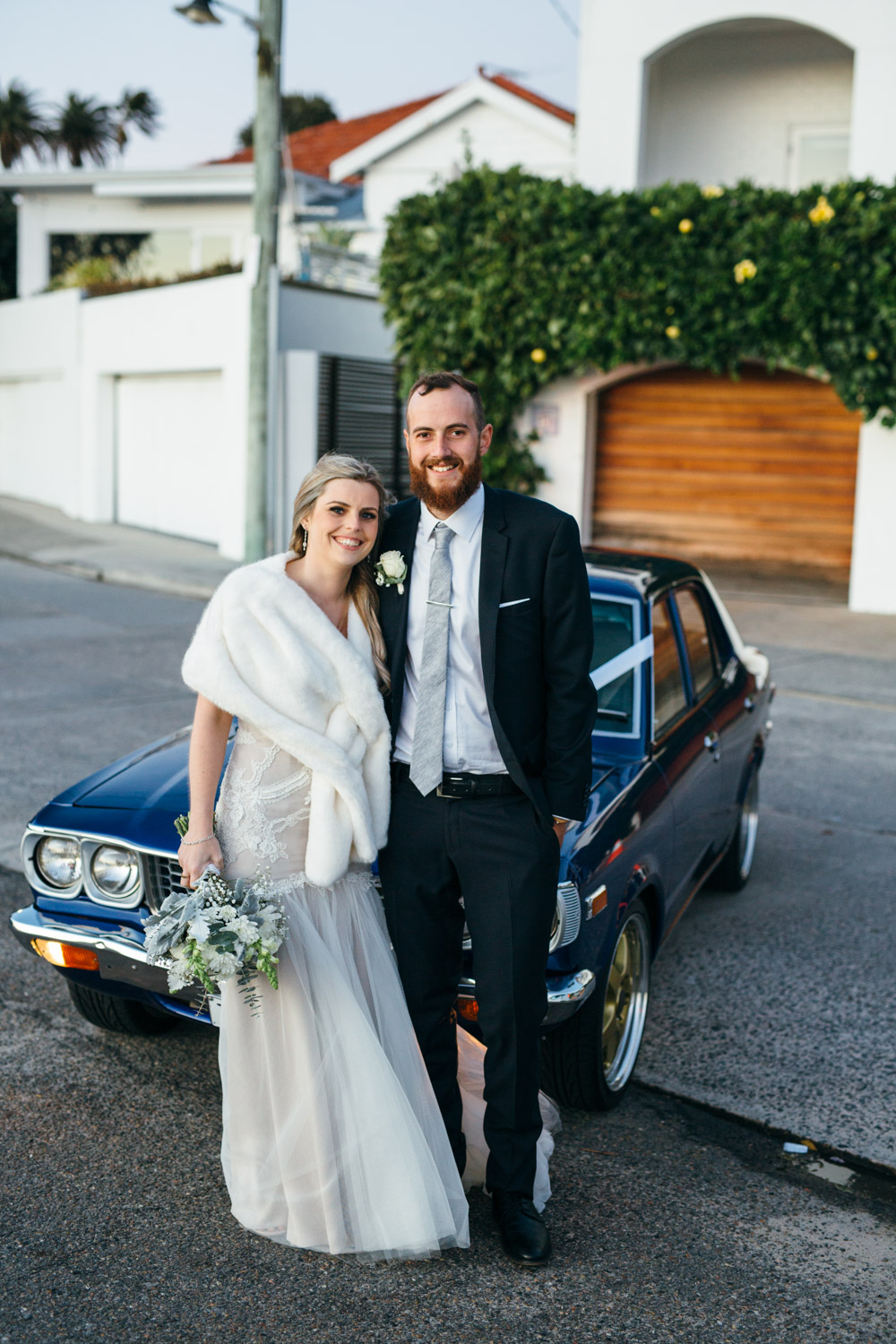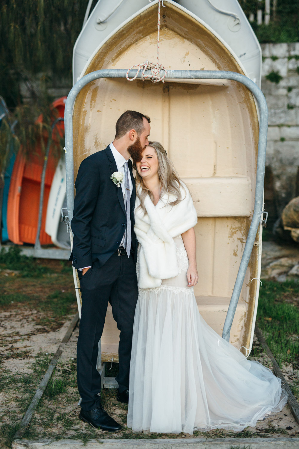 After the ceremony, we walked along Marine Parade for a few portraits with Casee and Harley, and also ventured west of the Ferry Wharf to the Watsons Bay Baths and Gibsons Beach (there is a blue corrugated shed that creates a cool backdrop and also shelters from the wind right near the baths). The blue corrugated backdrop gives an alternative look to wedding photographs, which I think is nice. Variety is key! Check out this Dunbar House wedding featuring some additional shots of the same blue corrugated shed.
