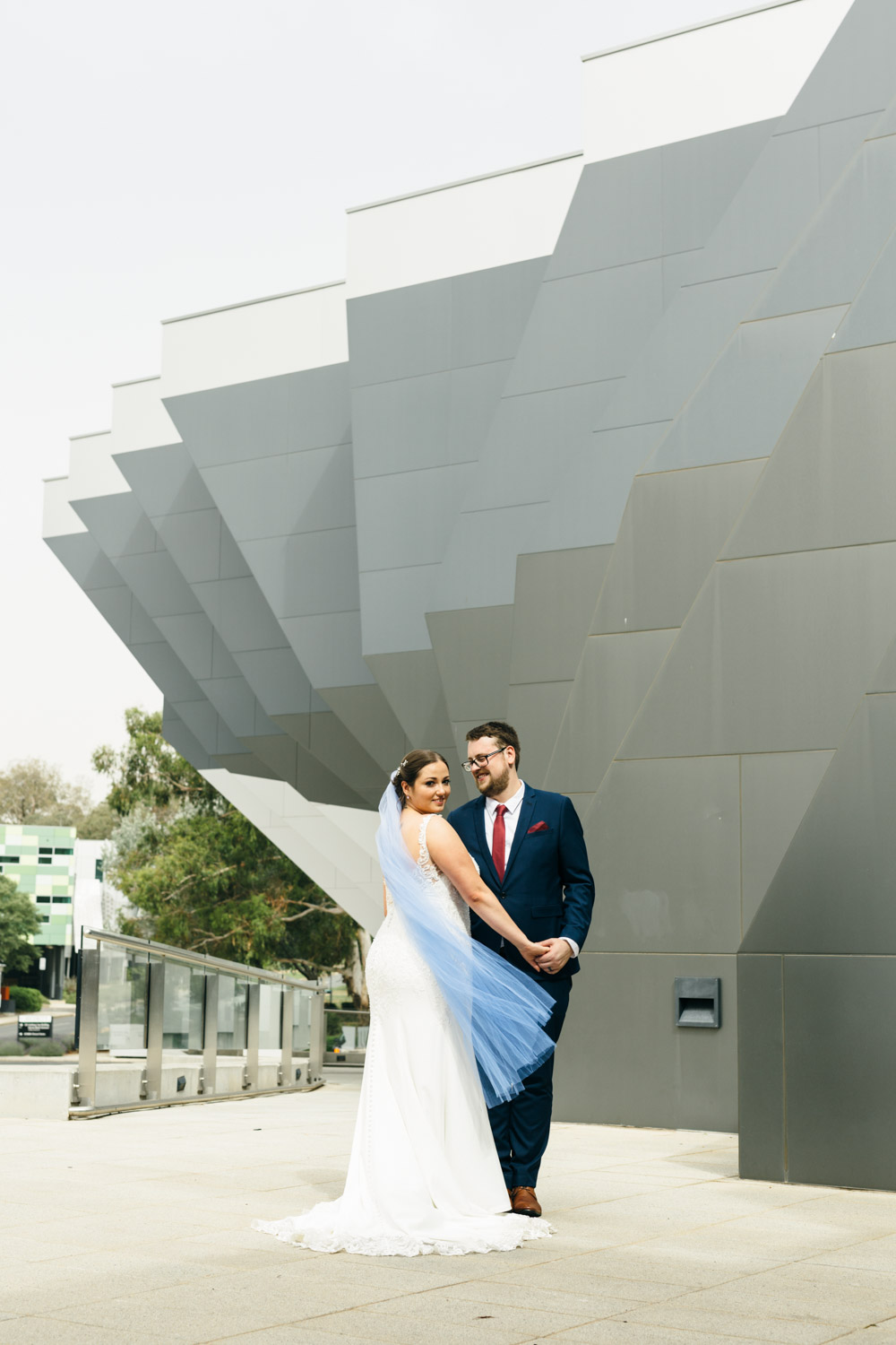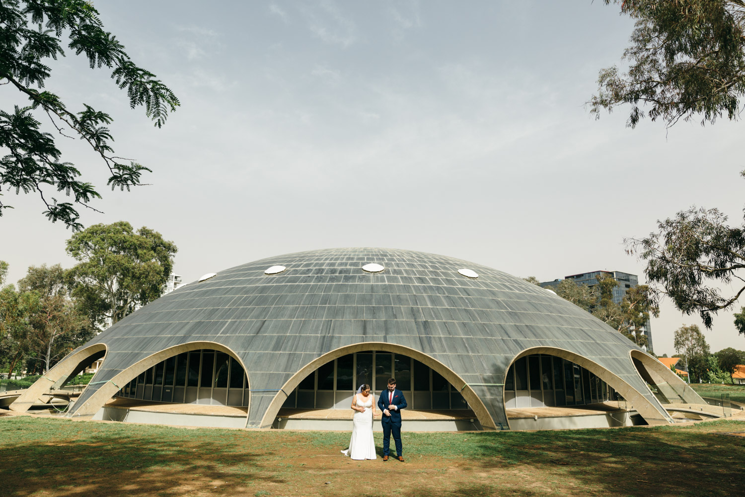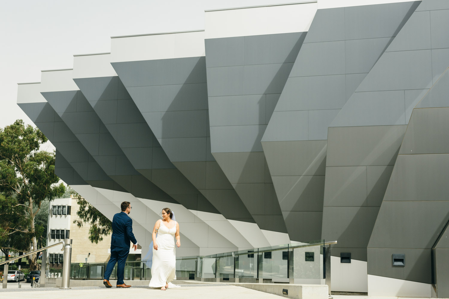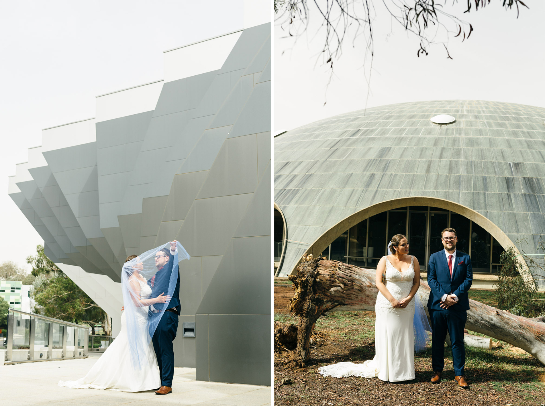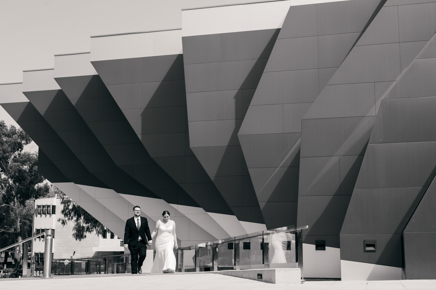 I spent the weekend down in Canberra. I spent a few hours scoping locations for their bridal portraits at an earlier visit that year, and after discussing some ideas with Matt and Skye, we decided on taking wedding photos at some striking buildings, including the John Cutin School of Medical Research – a contemporary glass structure featuring large upwards-fanning fins; and also The Shine Dome – a large but flat grey structure with repeating archways that is the Australian Academy of Science.