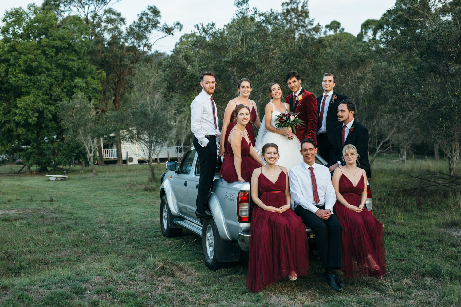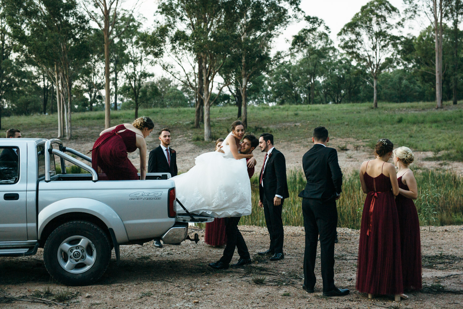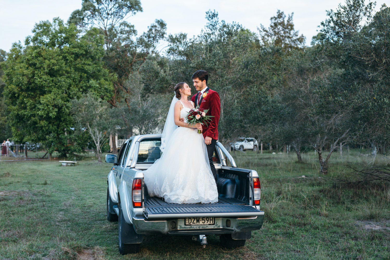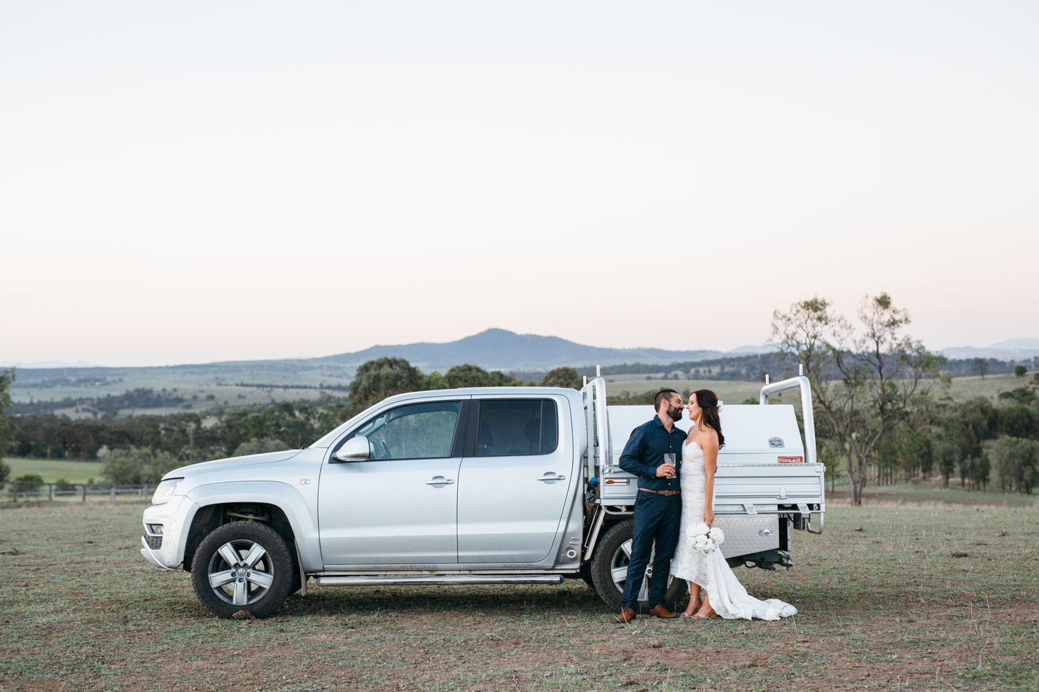 JF’s parents had a property in the neighbouring town of Glendonbrook, that hosted the evening’s reception. Before entering the reception we spent some time around the property taking some portraits amongst an olive orchard, and also on JF’s new ute. We timed the session perfectly with golden hour, to capture some lovely light.