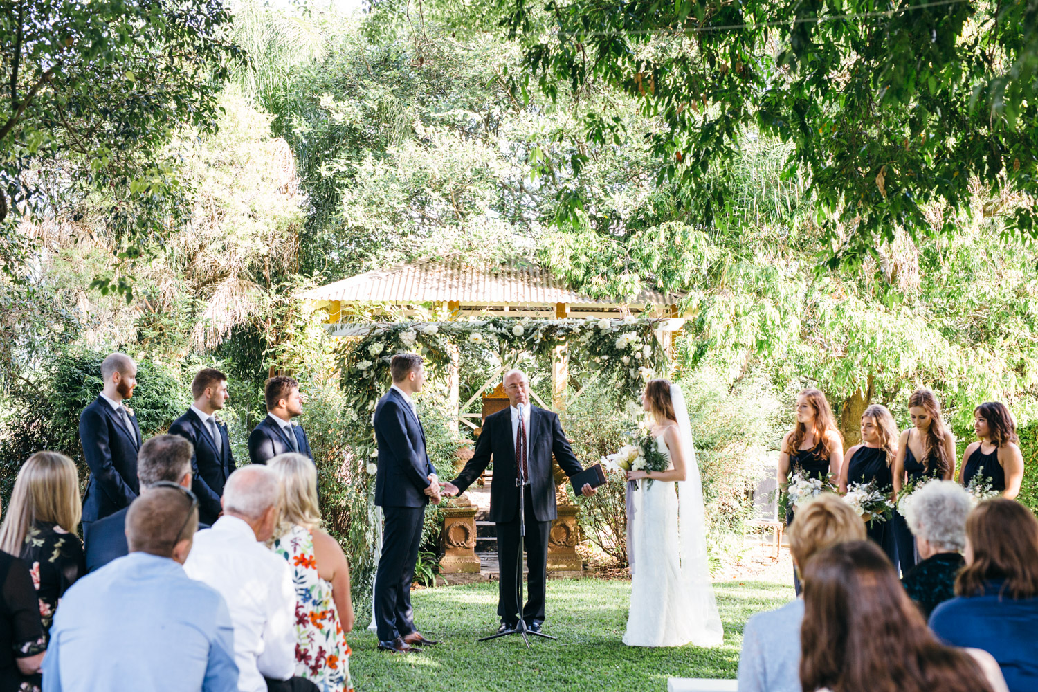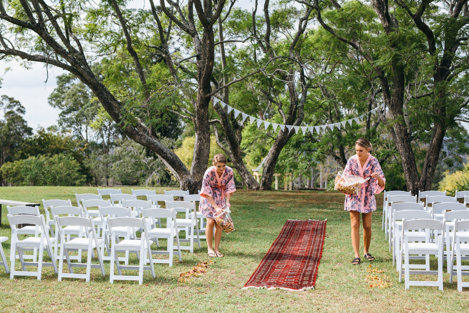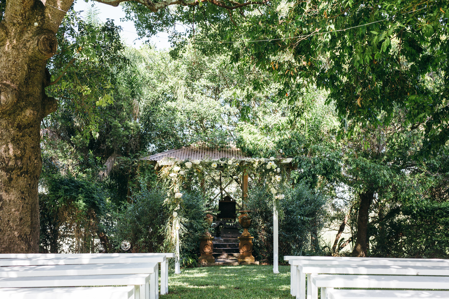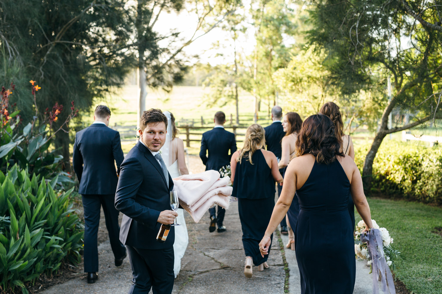 Back at Wallalong; the wind was picking up. After a late change to the ceremony location to shelter from the weather, Emma’s team set up the chairs around the back of the estate. The awesome variety around all sides of the homestead meant that she could almost any side for the ceremony and the backdrop would be lovely. The green ivy wall was a great choice.