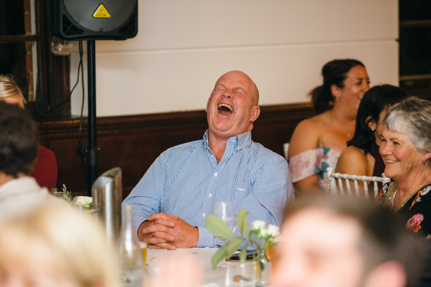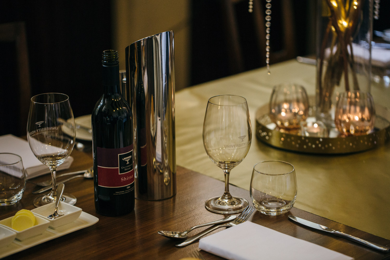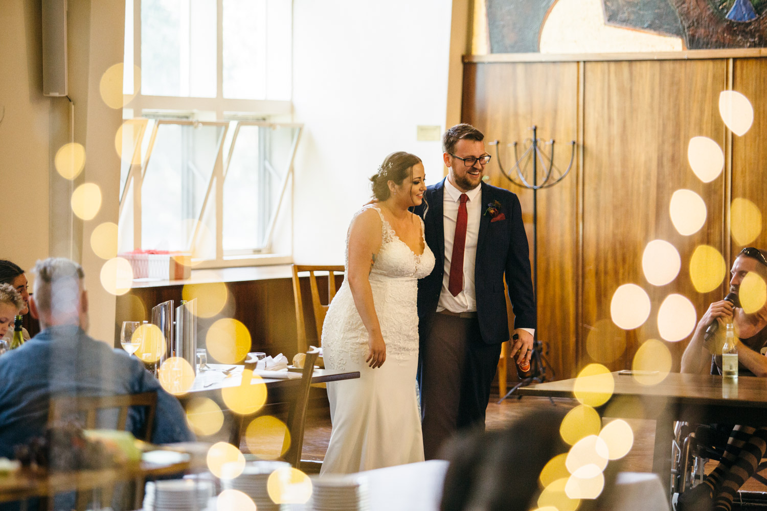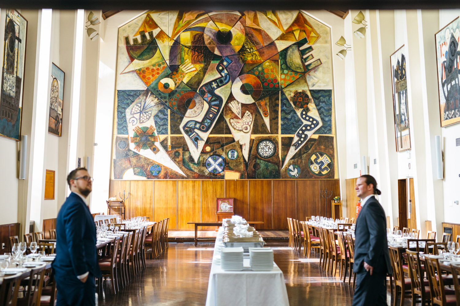 Skye and Matt got ready at University House before having a first look along the corridors outside of the Library and Common Room. Their ceremony was in the courtyard on the grass under large trees, where we also took some family portraits after their ceremony. Their lunchtime reception was held in the Great Hall of University House. The interiors of University House are really lovely. The Great Hall is opulent and vast, and the ceilings are dramatically decorated. The large windows gave great light and cast some interesting shadows over feature walls.