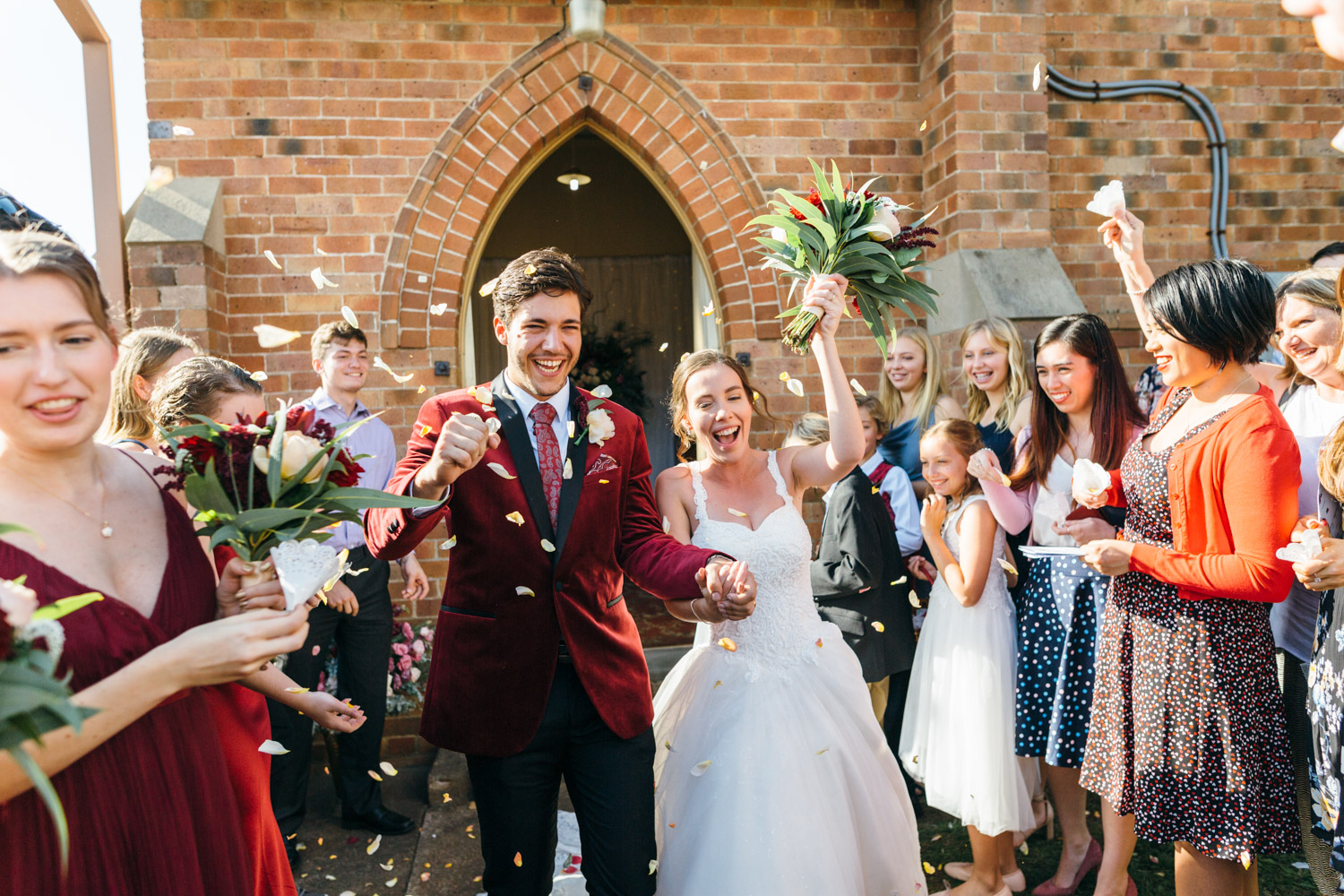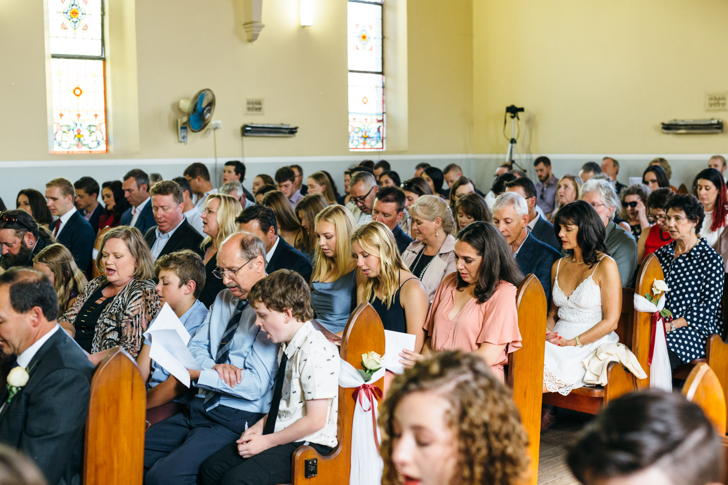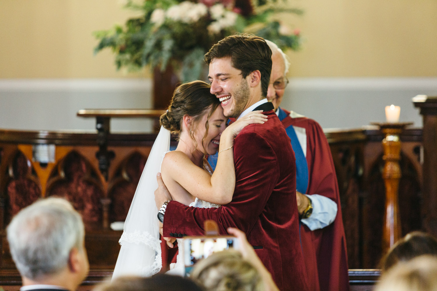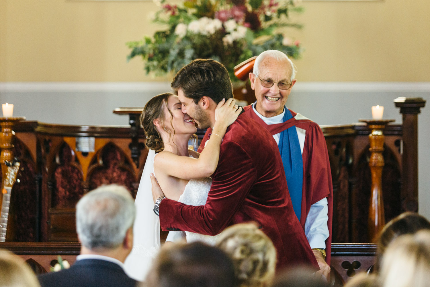 Aimee and JF’s ceremony, held in the Branxton Uniting Chapel in Branxton (around 20 minutes east of Singleton) was lovely. The light inside the chapel was soft and flattering. The memorable thing about their ceremony was that after the celebrant pronounced Aimee and Jacobus to be husband and wife, he didn’t invite JF to kiss his bride. JF, unsure of what to do, simply asked the question, to which their celebrant conceded with a chuckle; “Of course… You may now kiss your bride”. The chapel erupted in laughter as they kissed.