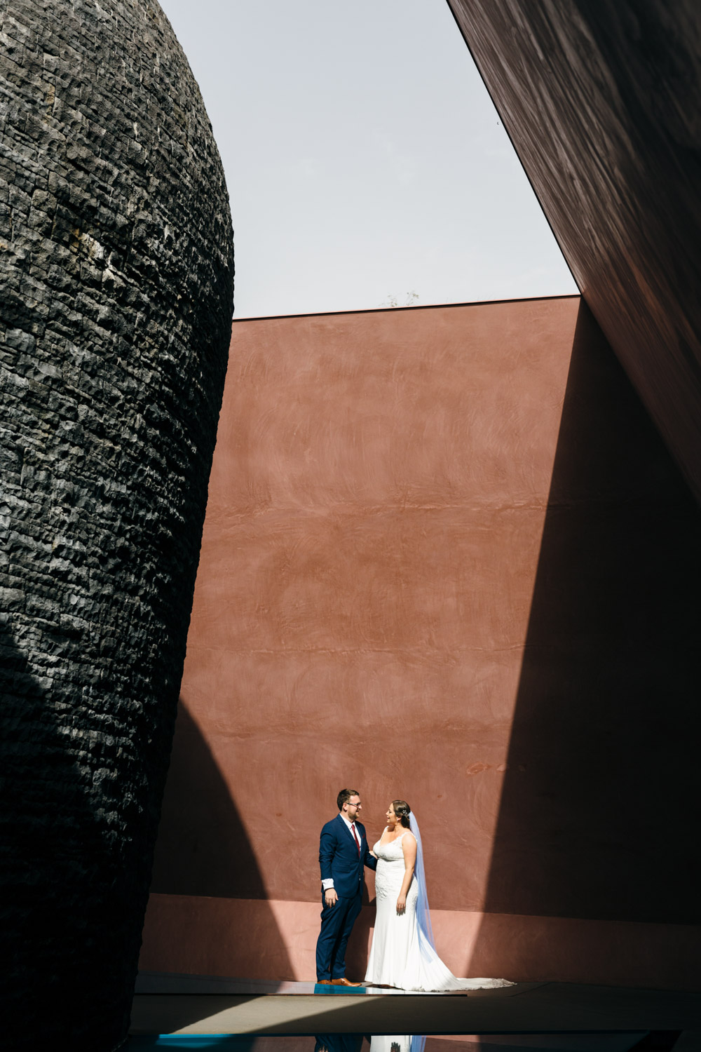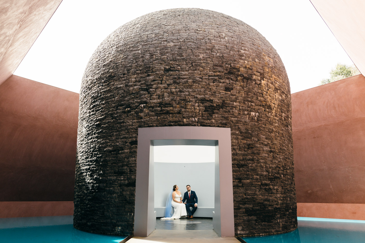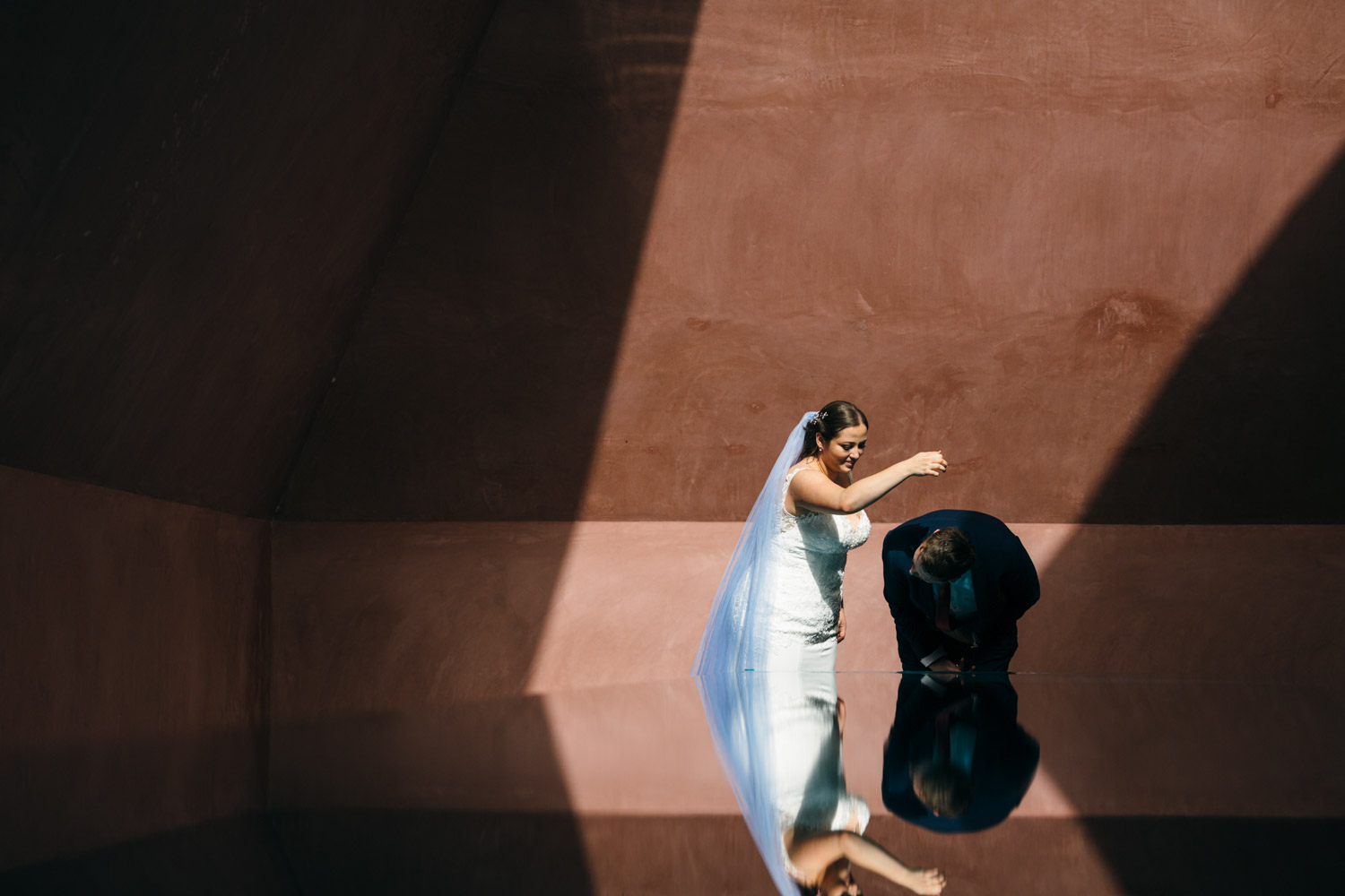 After the reception, we drove around to a few of the above-mentioned buildings to capture some portraits with architecture in mind, before heading to The National Gallery of Australia. The NGA front courtyard is home to a James Turrel sculpture exhibition called ‘Within Without 2010’, where a “skyspace” shapes the daylight inside a really interesting water-featured square pyramid. The internal geometry, reflections and lighting conditions inside the skyspace are really striking. James Turrel, in his exhibition, uses the available light as his creative medium and shapes the way his viewers perceive the sky above the sculpture. The conditions inside create a really exciting backdrop for powerful imagery and for me was the highlight of this Canberra wedding. I highly recommend that you visit this location if you can for your own wedding!