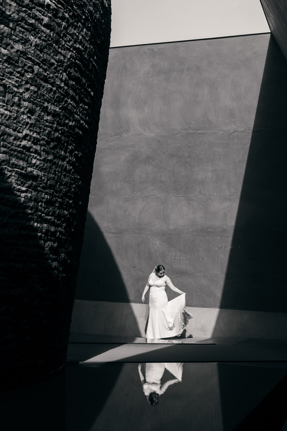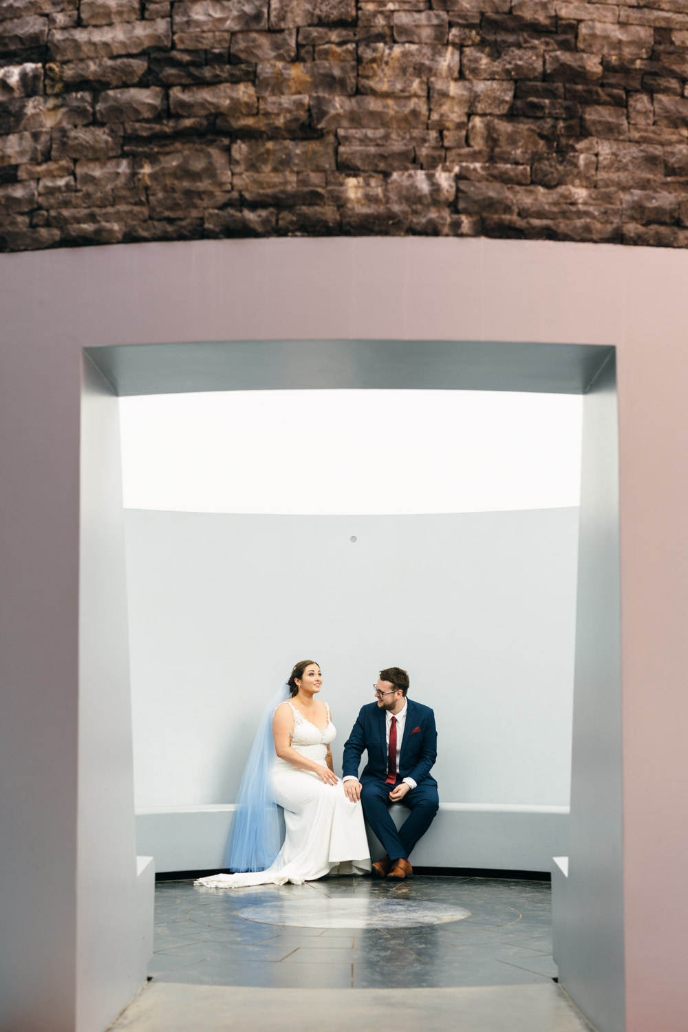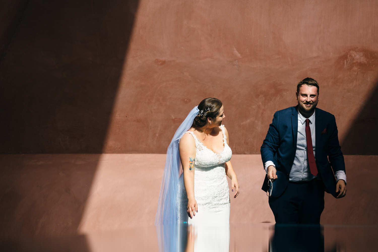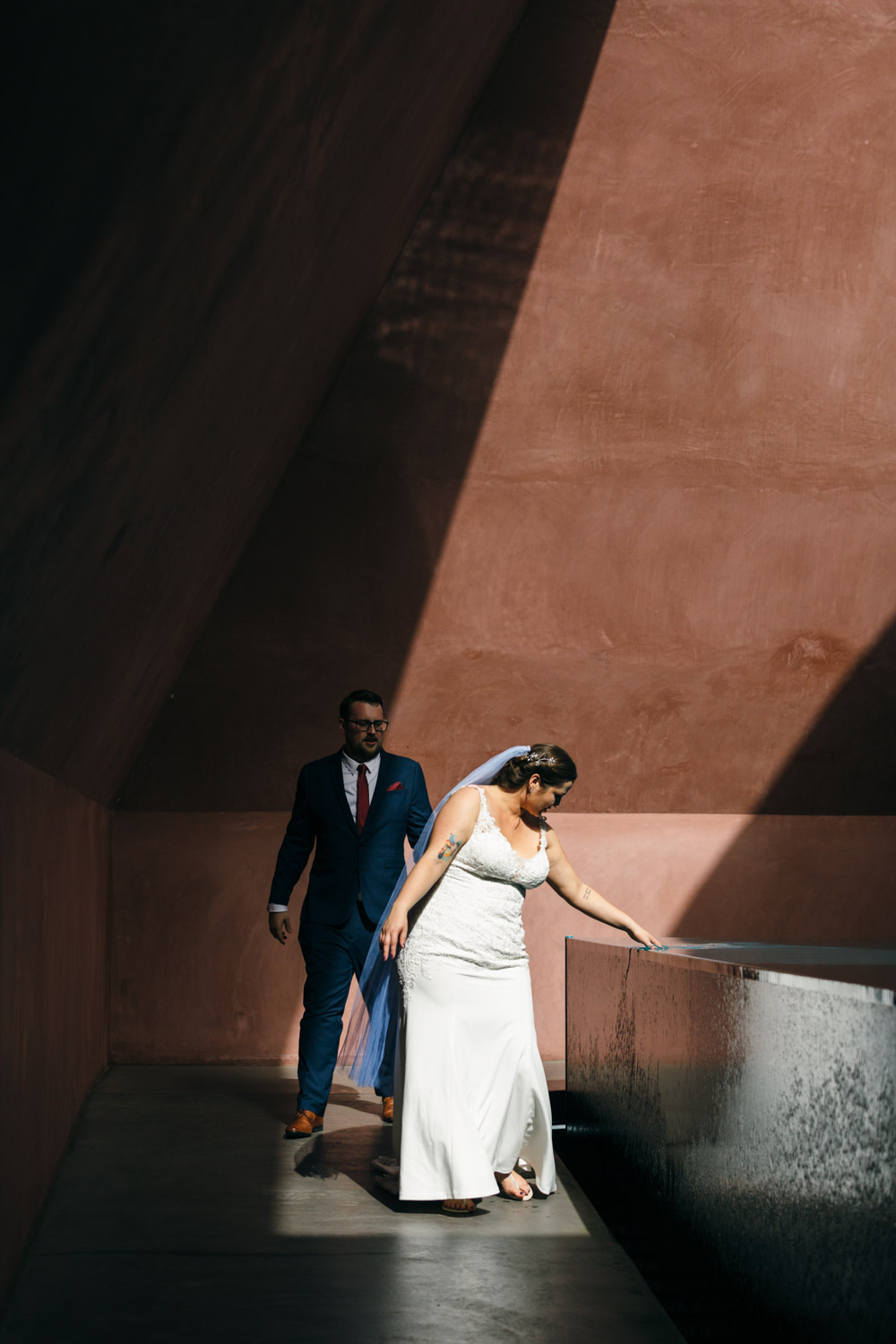After the reception, we drove around to a few of the above-mentioned buildings to capture some portraits with architecture in mind, before heading to The National Gallery of Australia. The NGA front courtyard is home to a James Turrel sculpture exhibition called ‘Within Without 2010’, where a “skyspace” shapes the daylight inside a really interesting water-featured square pyramid. The internal geometry, reflections and lighting conditions inside the skyspace are really striking. James Turrel, in his exhibition, uses the available light as his creative medium and shapes the way his viewers perceive the sky above the sculpture. The conditions inside create a really exciting backdrop for powerful imagery and for me was the highlight of this Canberra wedding. I highly recommend that you visit this location if you can for your own wedding!
