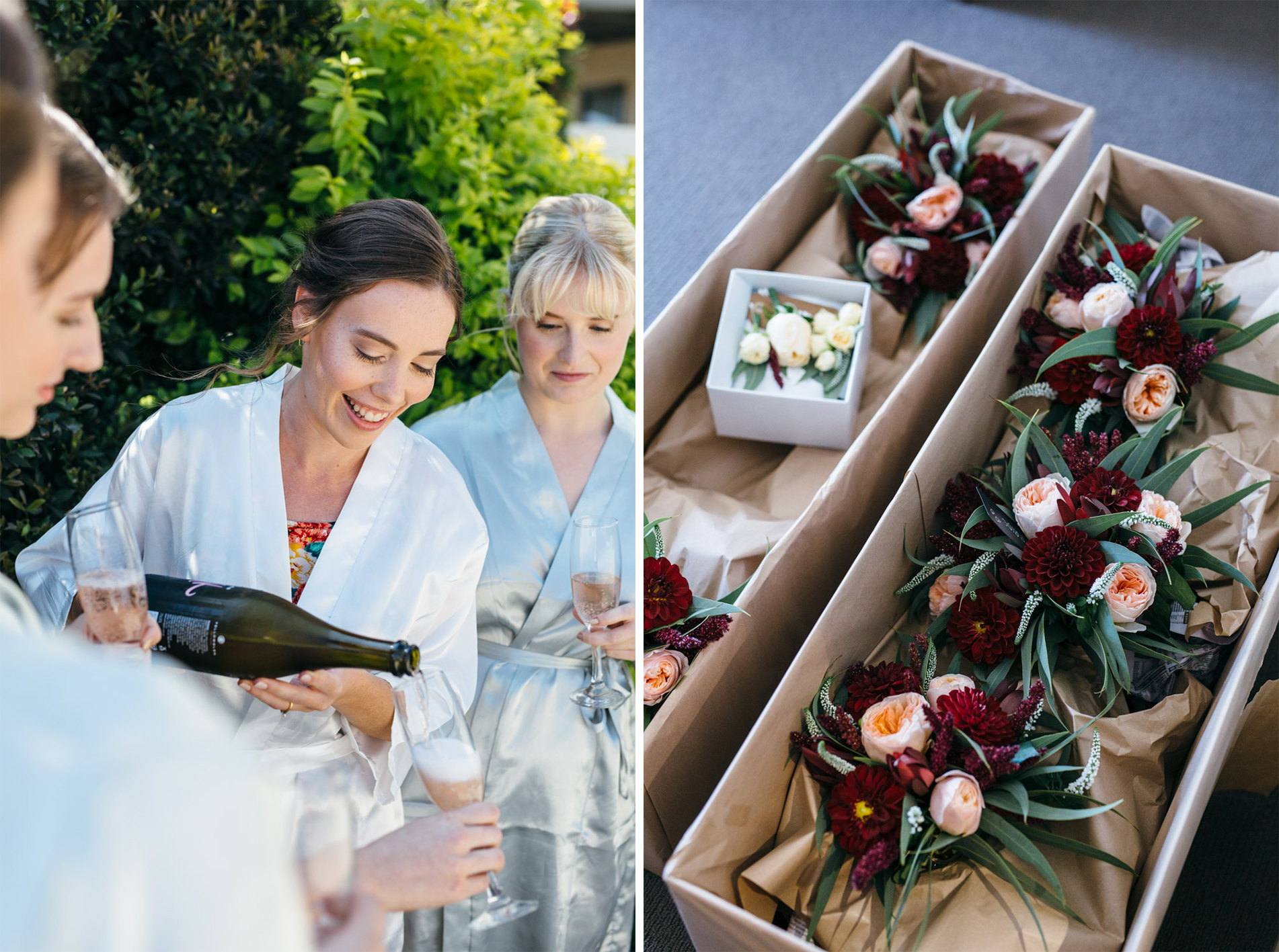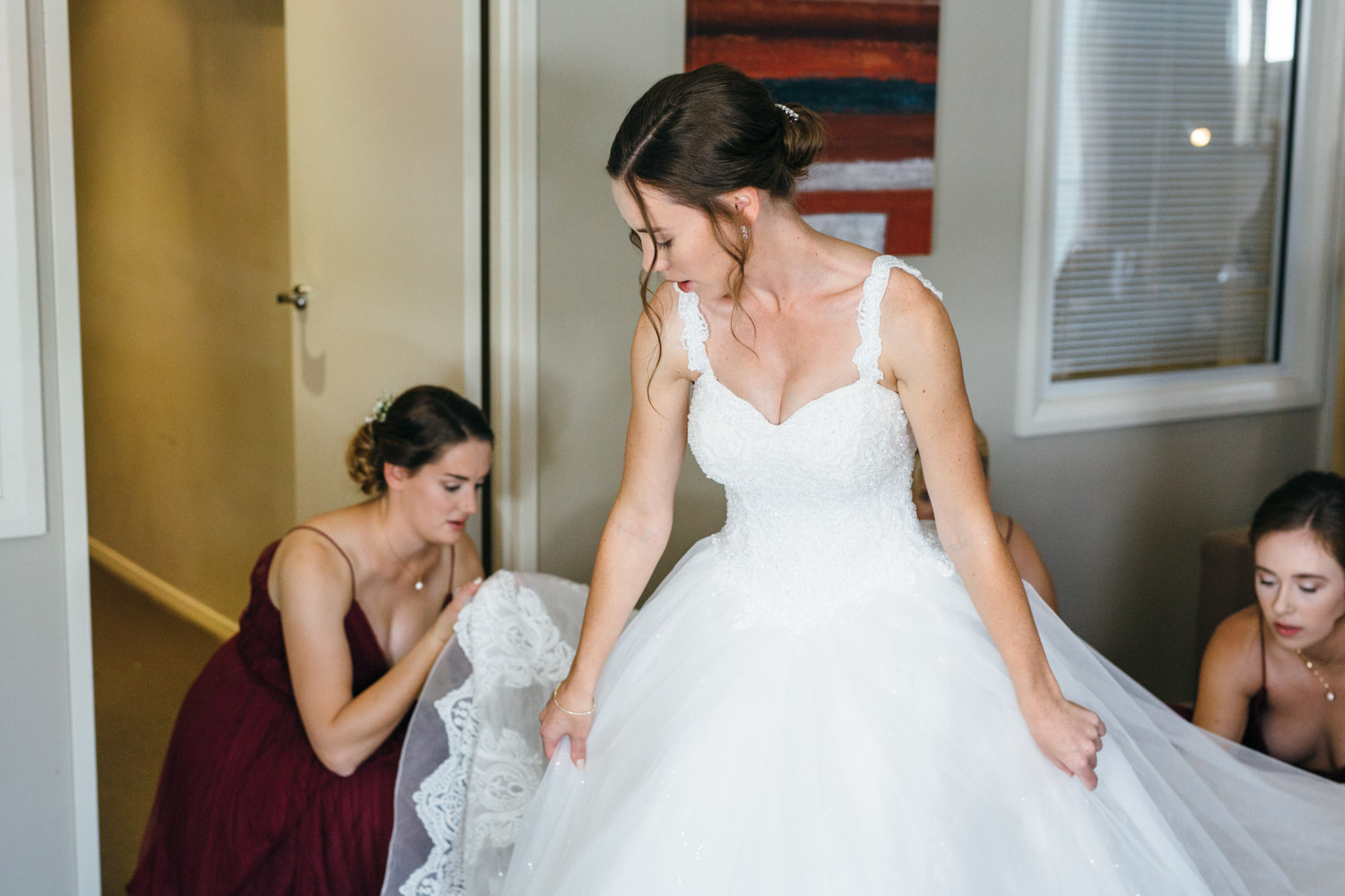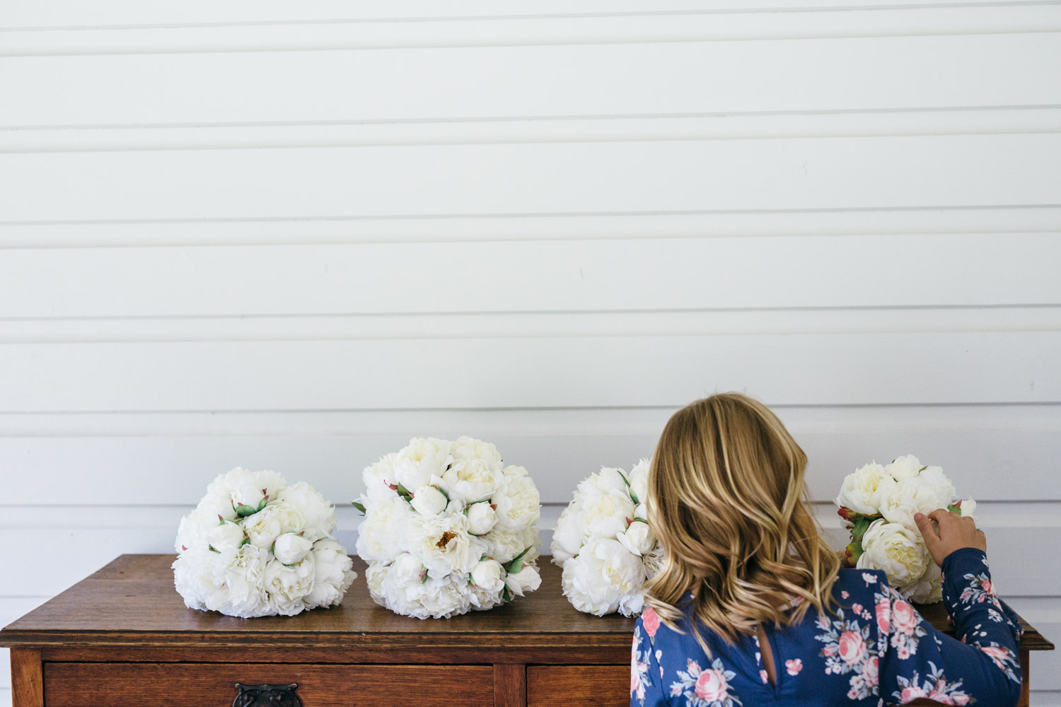 My day started at Wallalong House with Emma and her bridesmaids. Inside the homestead I captured a range of details (including Emma’s beautiful dress in the front living room) and then ventured out to the marque to see Emma’s florist finishing the floral arrangements. Emma’s wedding was always going to be on point – she’s a professional events planner, so the day was never going to disappoint.