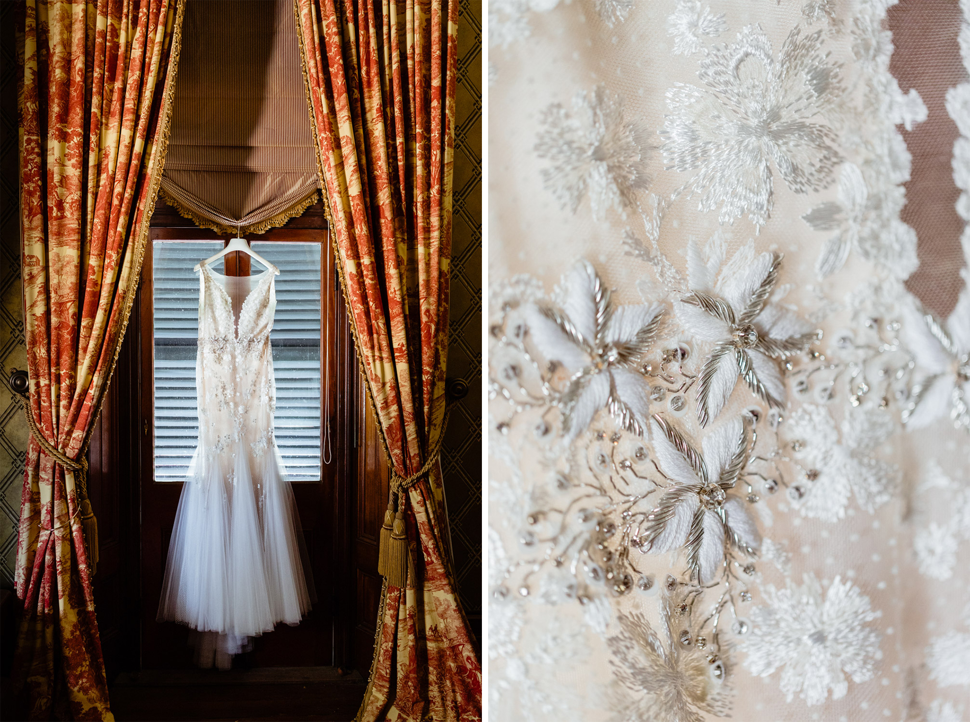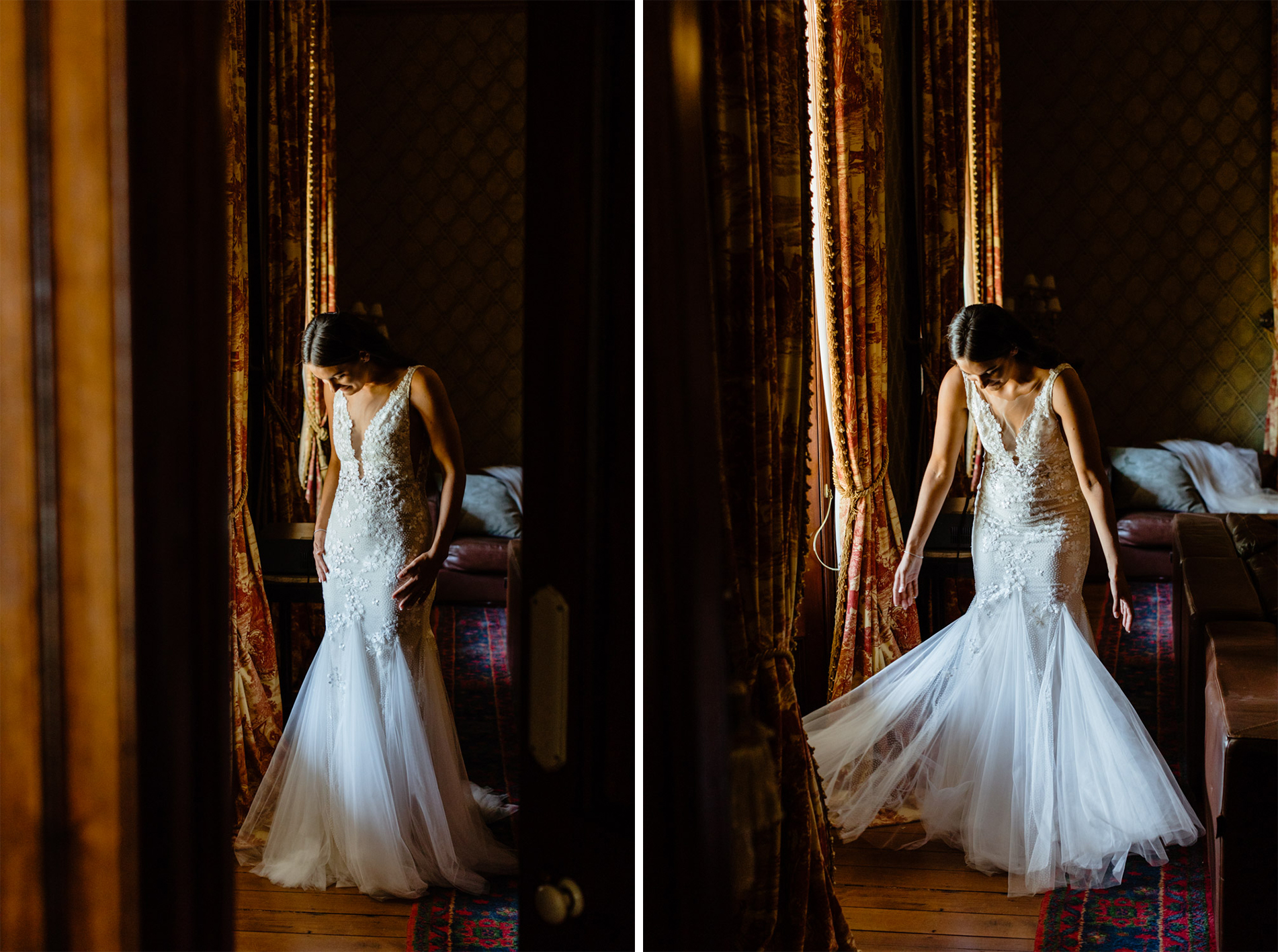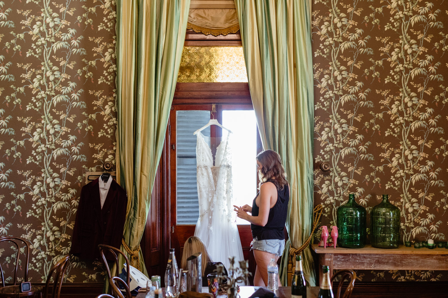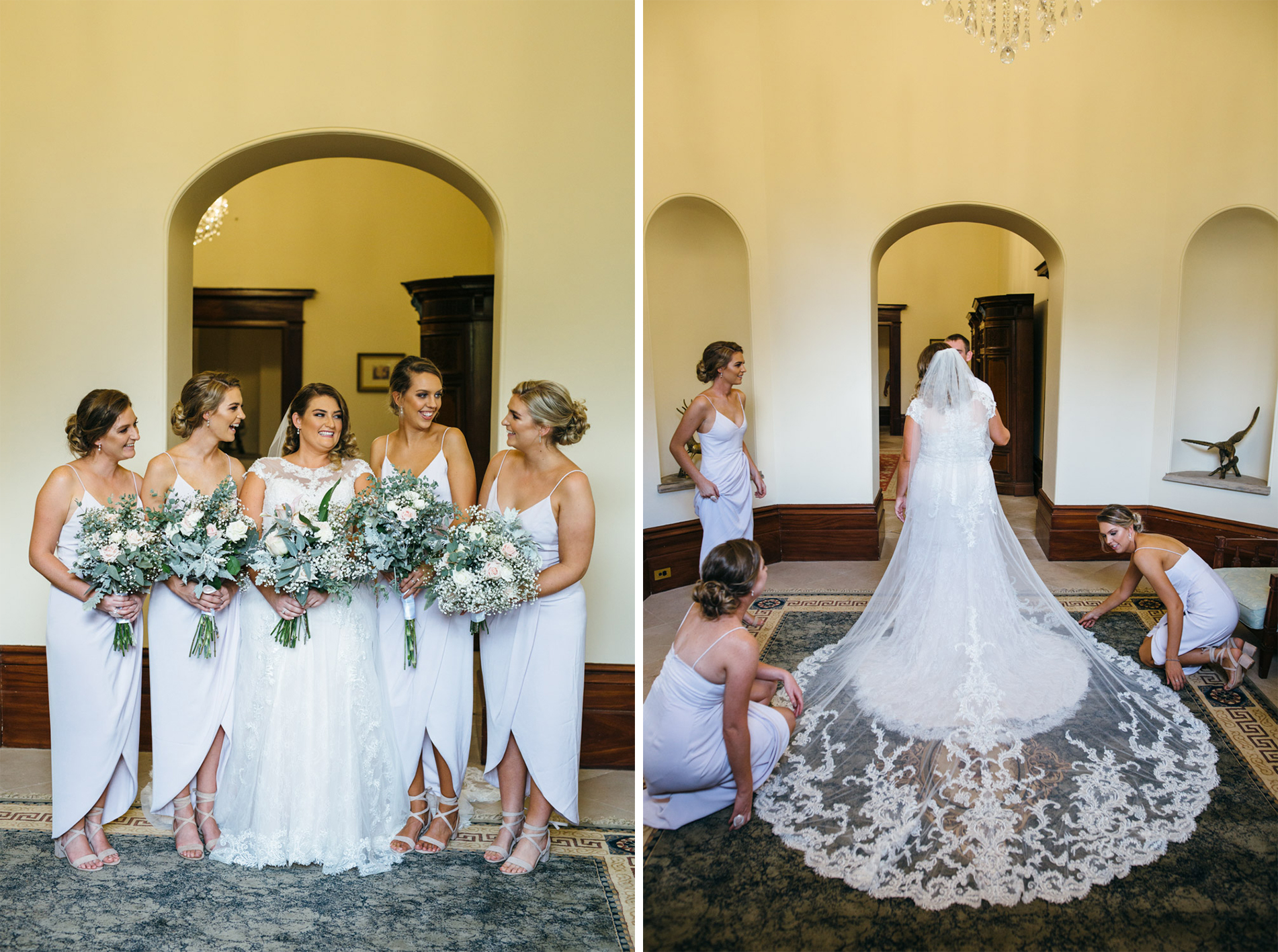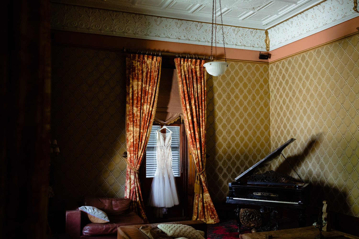 We covered the day with photography and films (you can view these in this blog post – scroll down!). Jess and Ben’s Fernhill Estate wedding started in the Manor house. Jess and her bridesmaids were getting ready in the main lounge room, where the massive floor-to-ceiling windows provided fantastic light. The great part about having a whole homestead to yourselves is that we were able to use lots of rooms to build on the variety in photographs. The homestead’s master bedroom was a nice backdrop to photograph Jess’ gown – see that photo in the collection below.