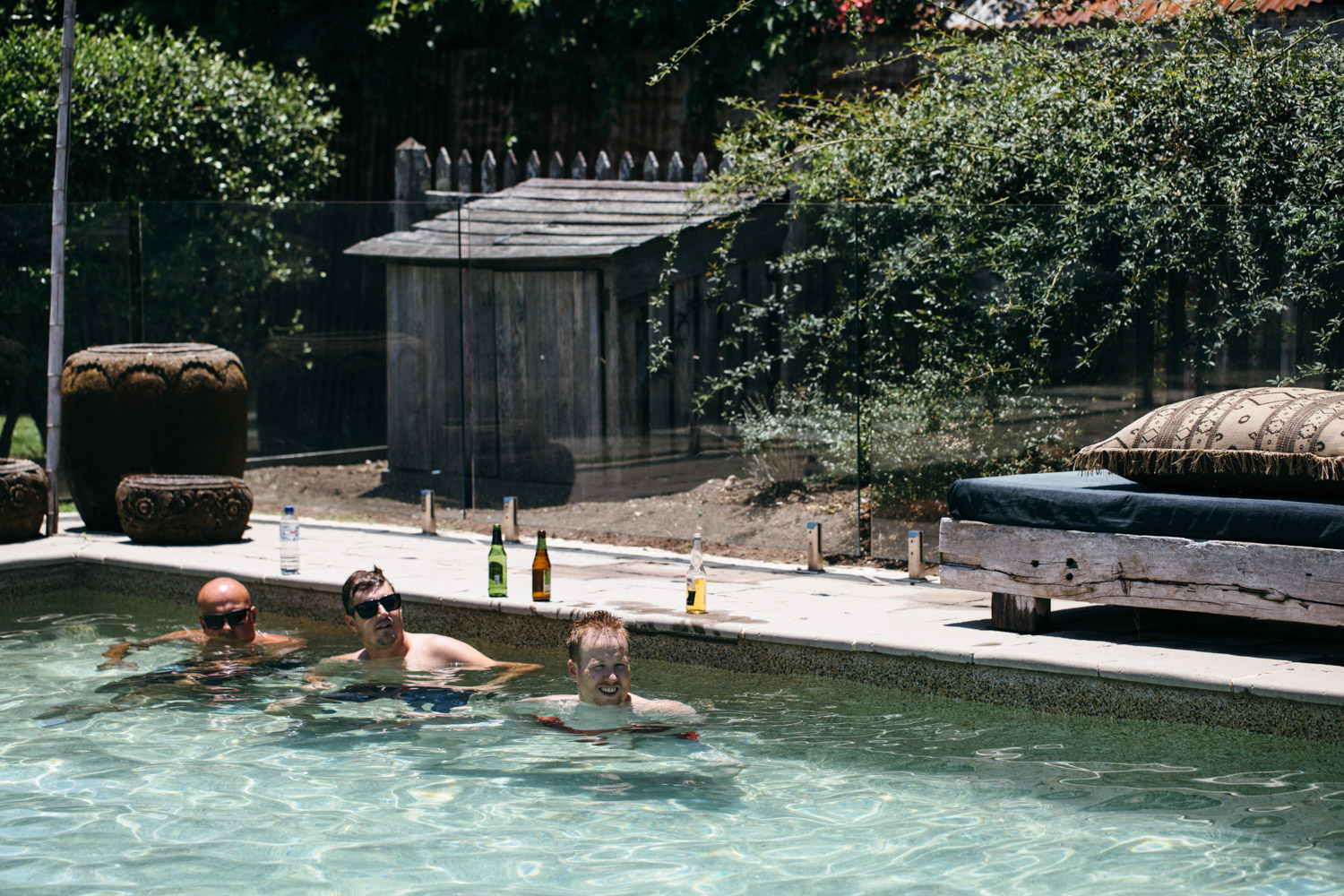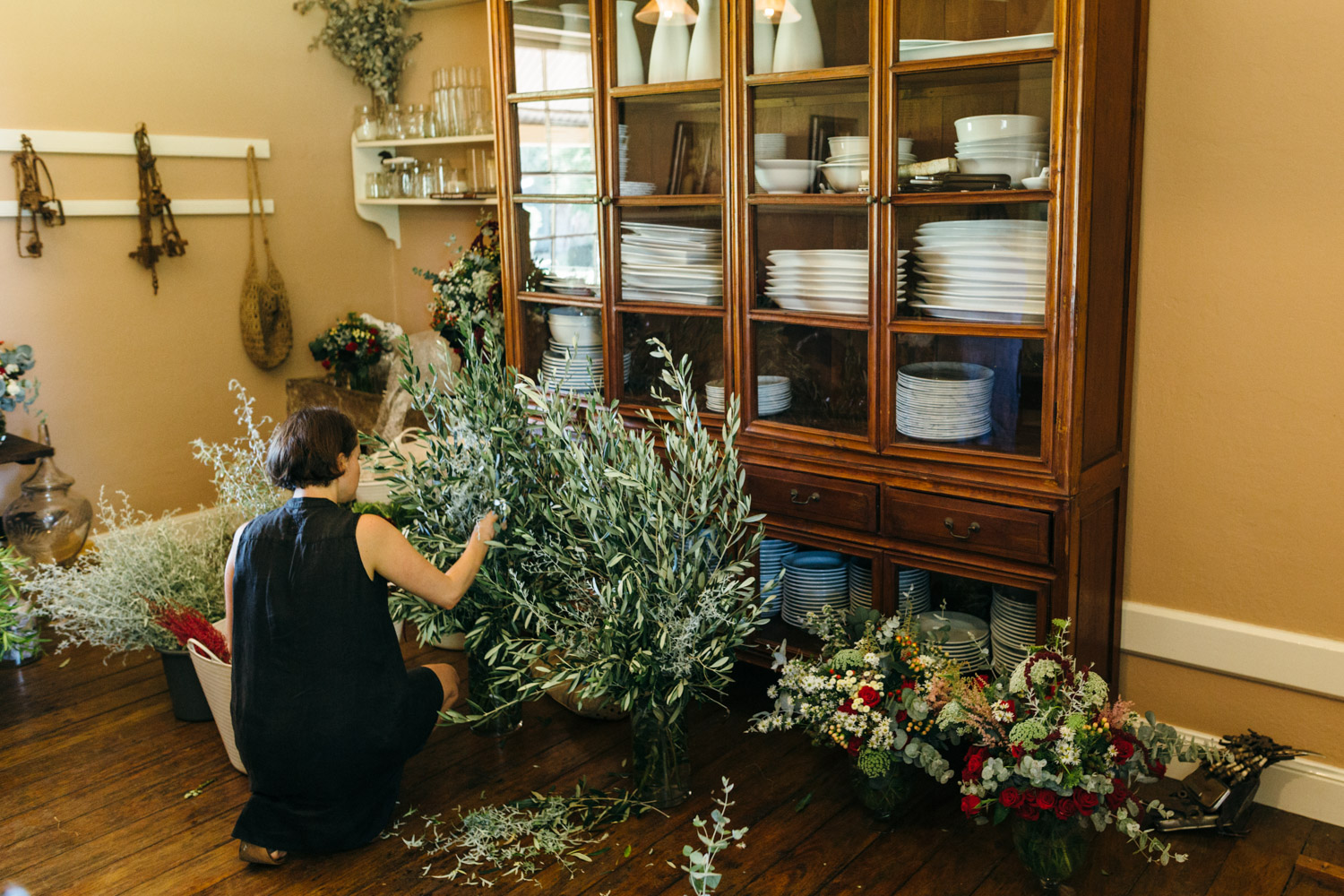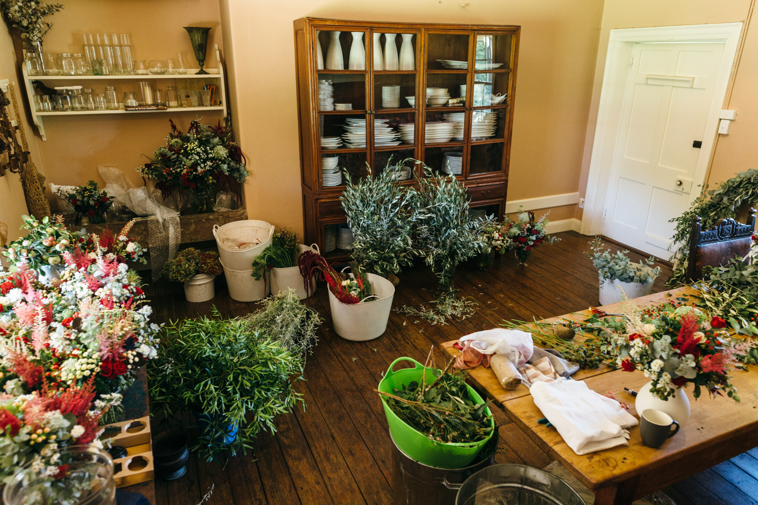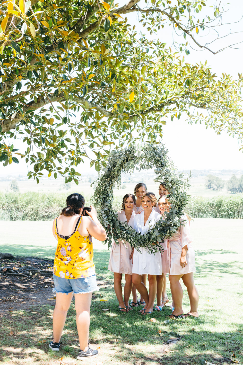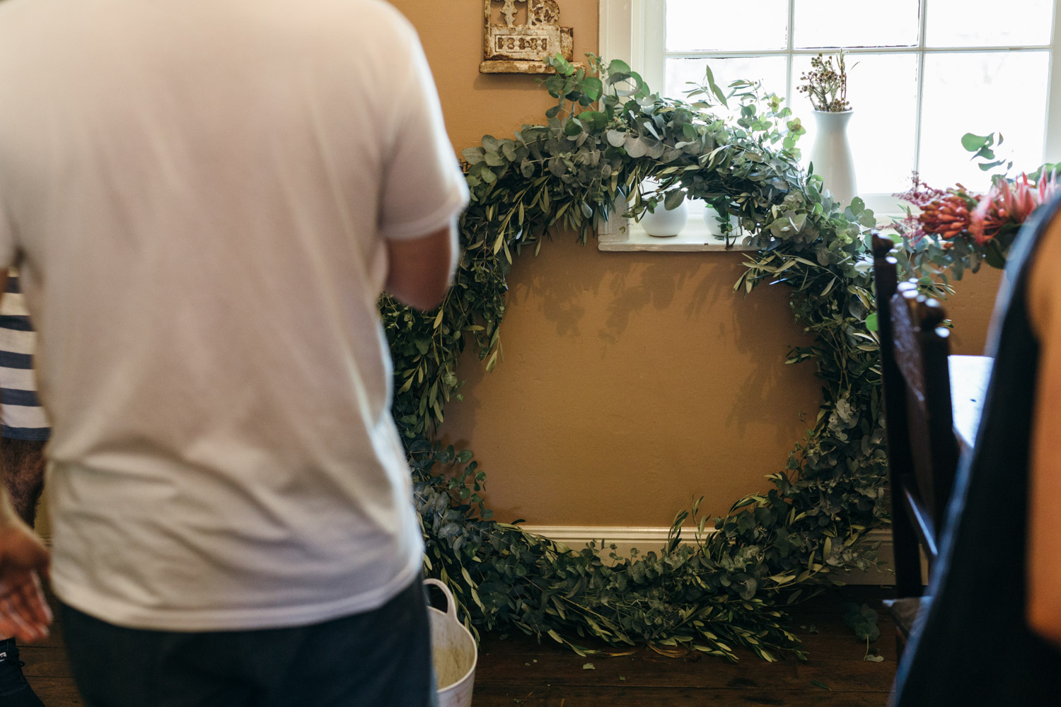 I arrived early in the morning. As you can see on my pricing page, I don’t work on a per-hour basis, rather I prefer to attend all day to provide full documentation. Danielle and Ben’s Wallalong House wedding was a warm one – in the peak of the Australian summer. Good thing the venue has a pool 😊. Danielle and Ben both got ready at Wallalong House – the ladies in the front half and the gents out the back. They did well to not see each other before the ceremony. In the middle of the house was a large kitchen, where Danielle’s friends essentially transformed the room into a temporary florist and produced all of the floral arrangements, including a massive wreath to hang from the trees in the front courtyard.