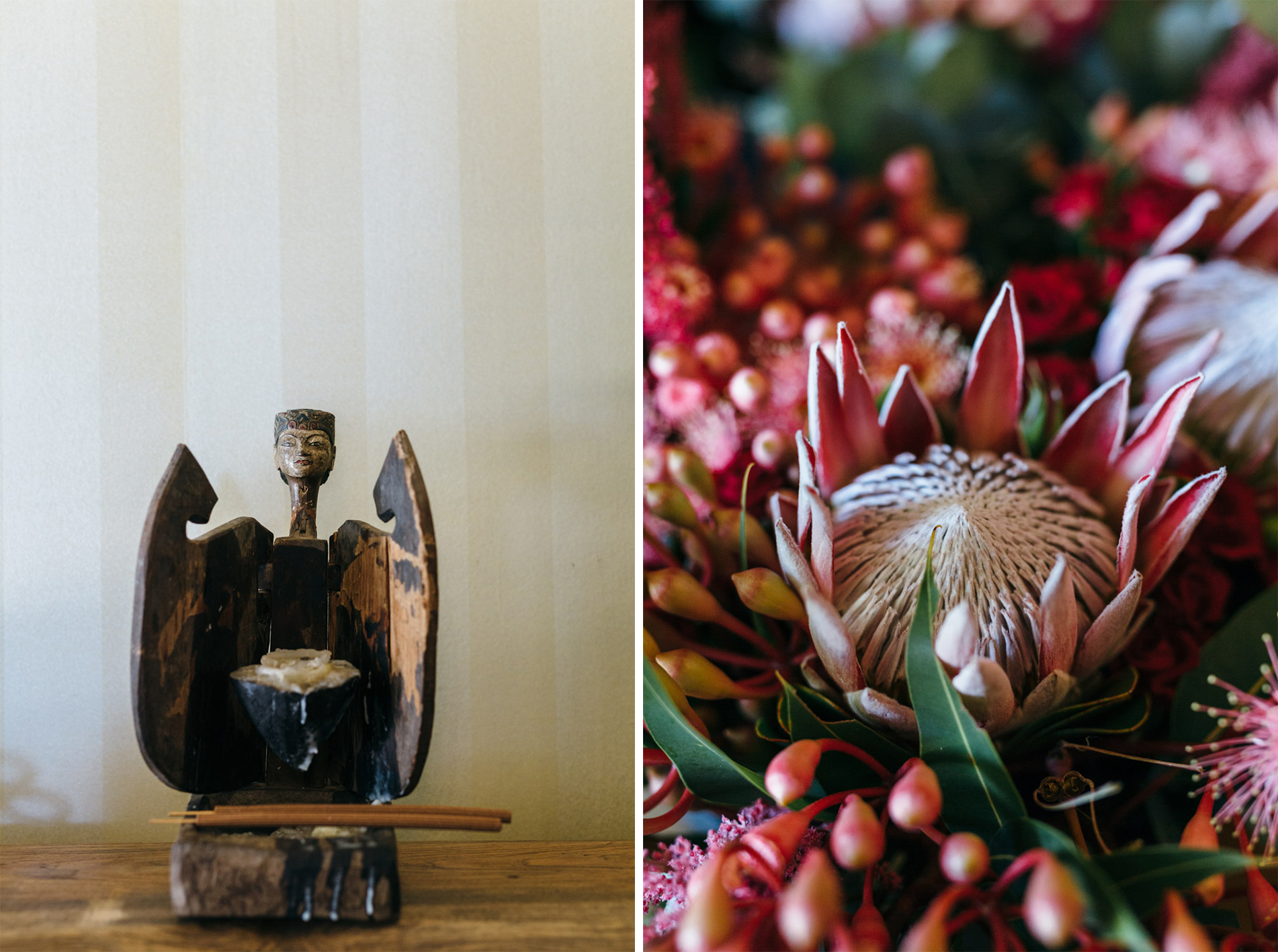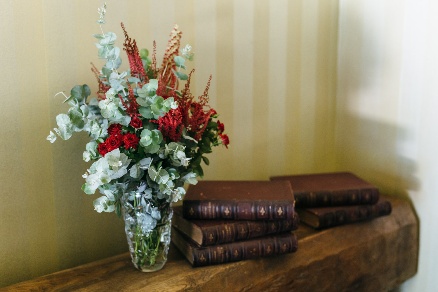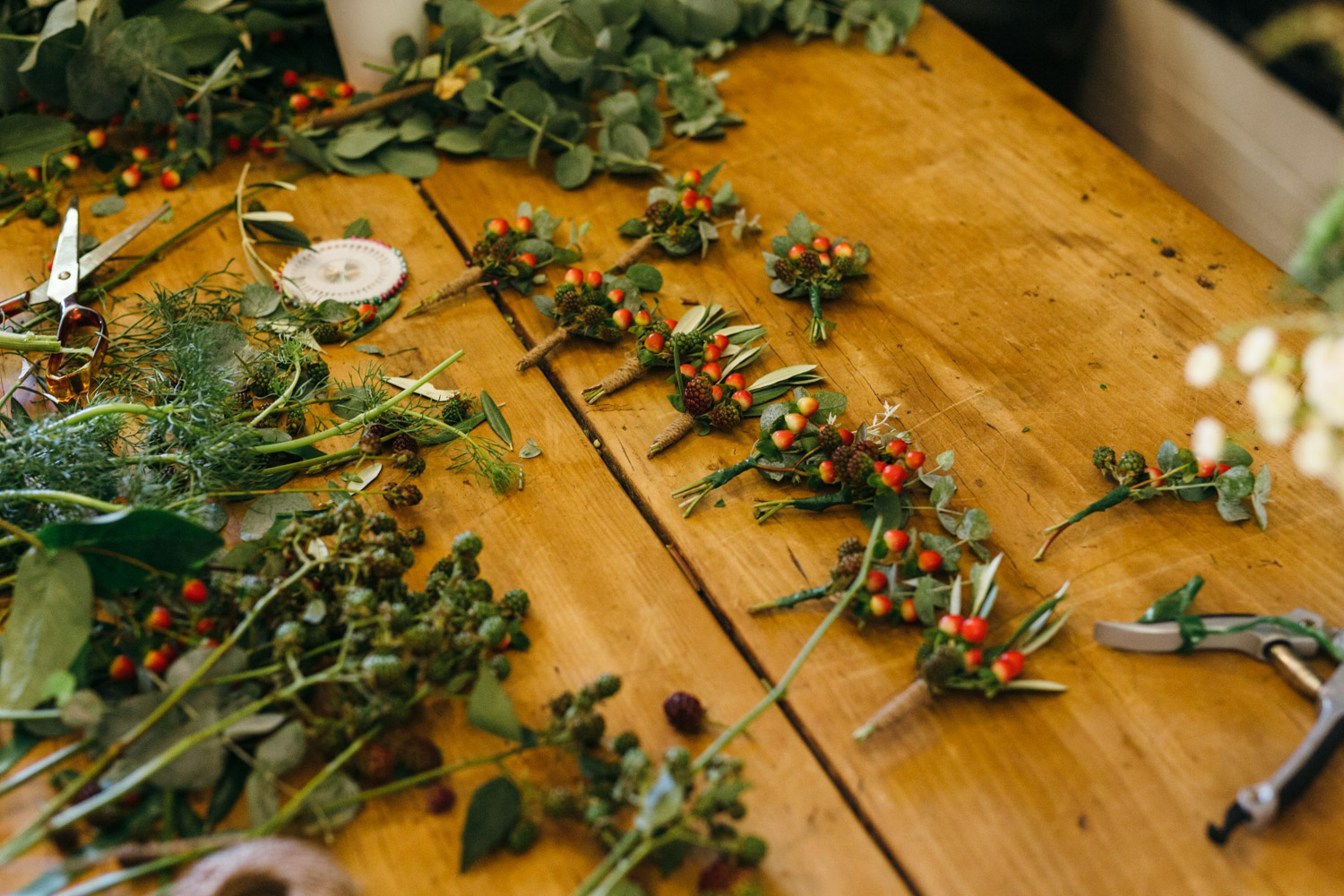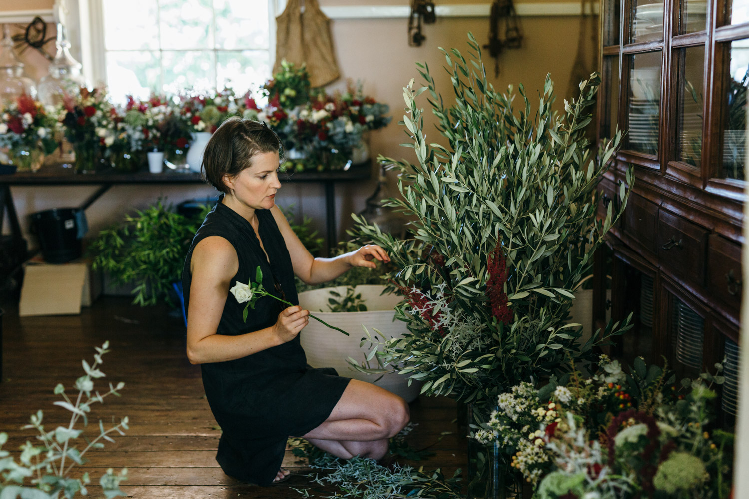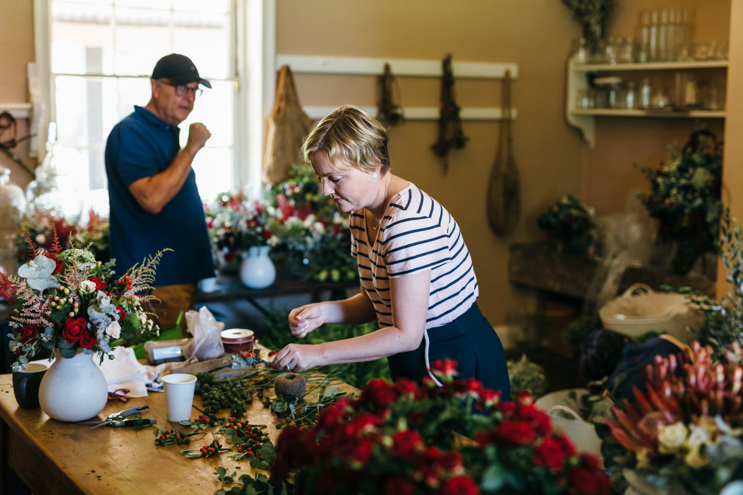 I arrived early in the morning. As you can see on my pricing page, I don’t work on a per-hour basis, rather I prefer to attend all day to provide full documentation. Danielle and Ben’s Wallalong House wedding was a warm one – in the peak of the Australian summer. Good thing the venue has a pool 😊. Danielle and Ben both got ready at Wallalong House – the ladies in the front half and the gents out the back. They did well to not see each other before the ceremony. In the middle of the house was a large kitchen, where Danielle’s friends essentially transformed the room into a temporary florist and produced all of the floral arrangements, including a massive wreath to hang from the trees in the front courtyard.