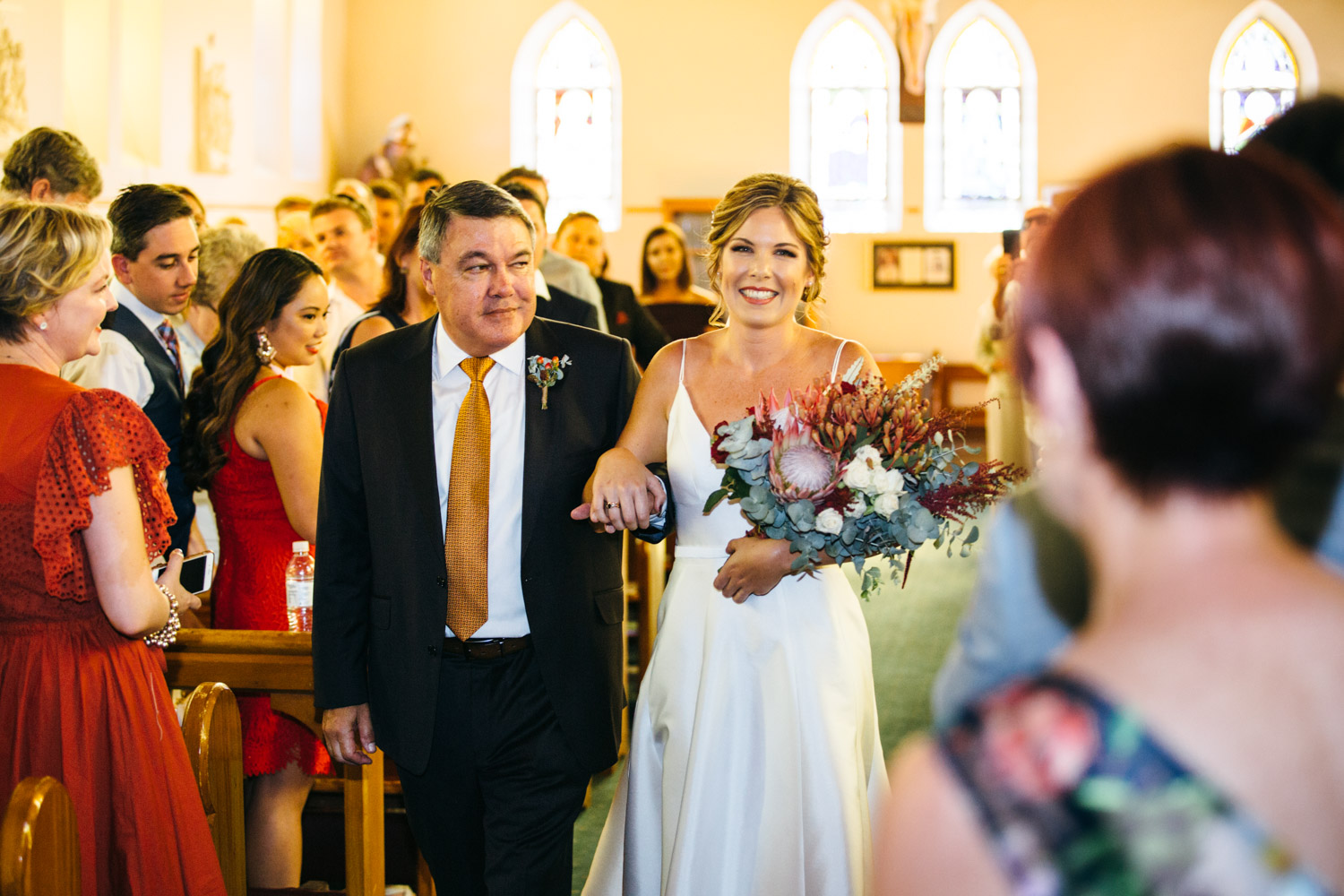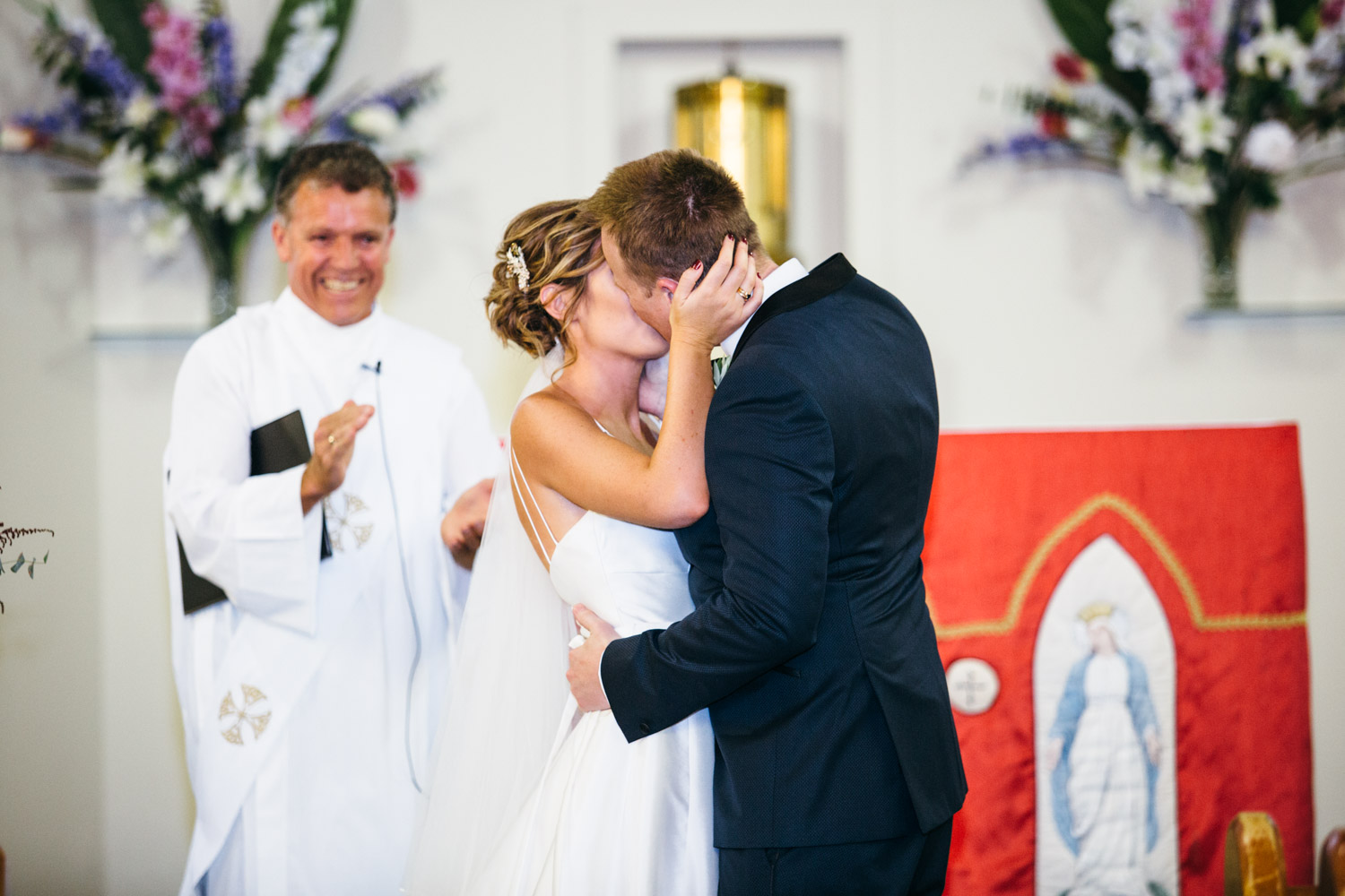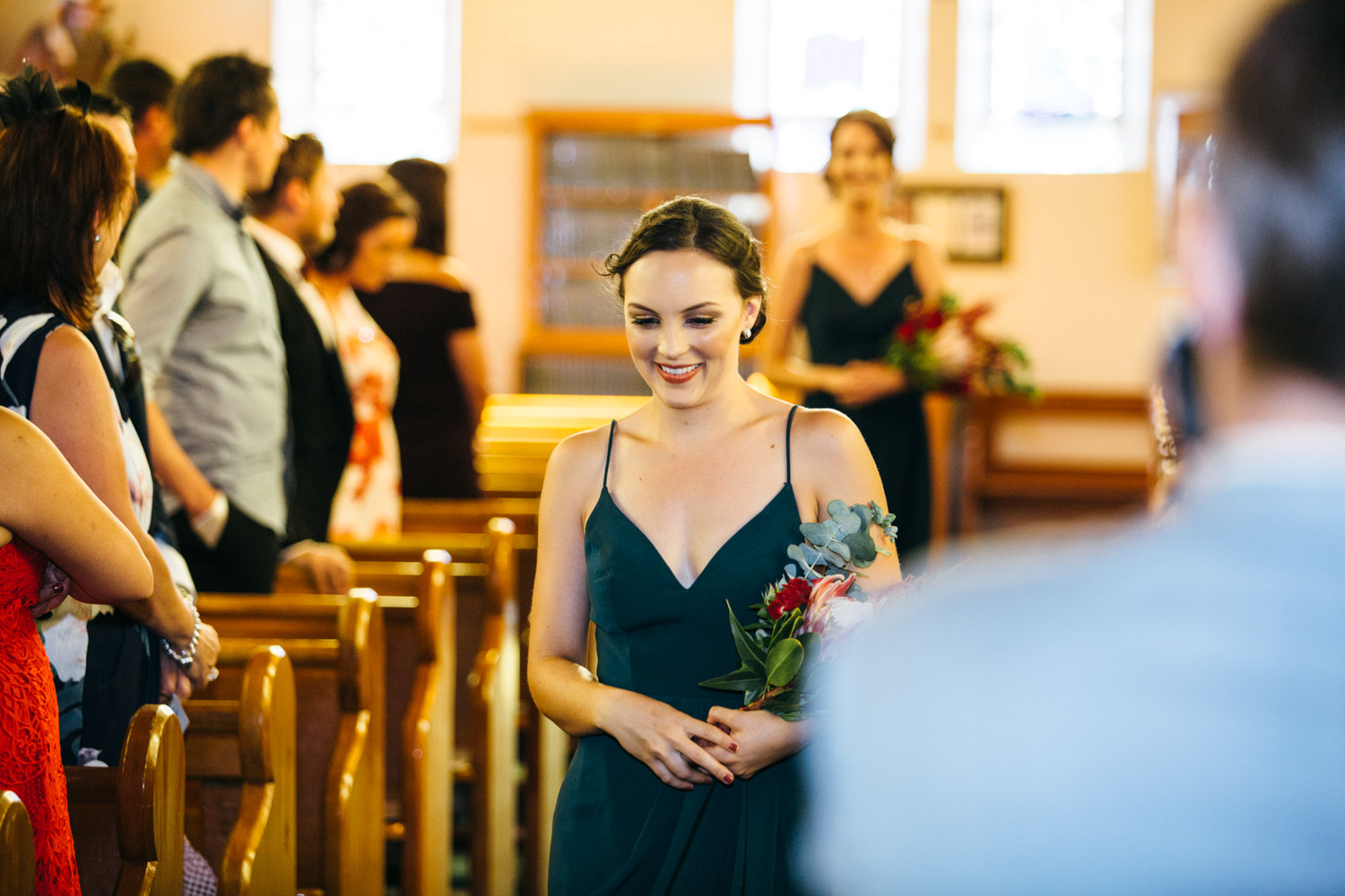 Aimee and JF’s ceremony, held in the Branxton Uniting Chapel in Branxton (around 20 minutes east of Singleton) was lovely. The light inside the chapel was soft and flattering. The memorable thing about their ceremony was that after the celebrant pronounced Aimee and Jacobus to be husband and wife, he didn’t invite JF to kiss his bride. JF, unsure of what to do, simply asked the question, to which their celebrant conceded with a chuckle; “Of course… You may now kiss your bride”. The chapel erupted in laughter as they kissed.